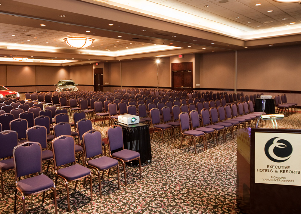 With 16 meeting rooms to accommodate from 10 to 800 people, The Executive Hotel Vancouver Airport offers versatile space for trade shows, auto shows (with easy access for vehicles of all sizes), conventions, seminars, board meetings, AGMs, banquets, weddings and Bar Mitzvahs. Use of our facilities includes High-Speed Internet Access, use of the Business Centre and Video Conferencing services. There is ample parking space and indoor secure parking is available.